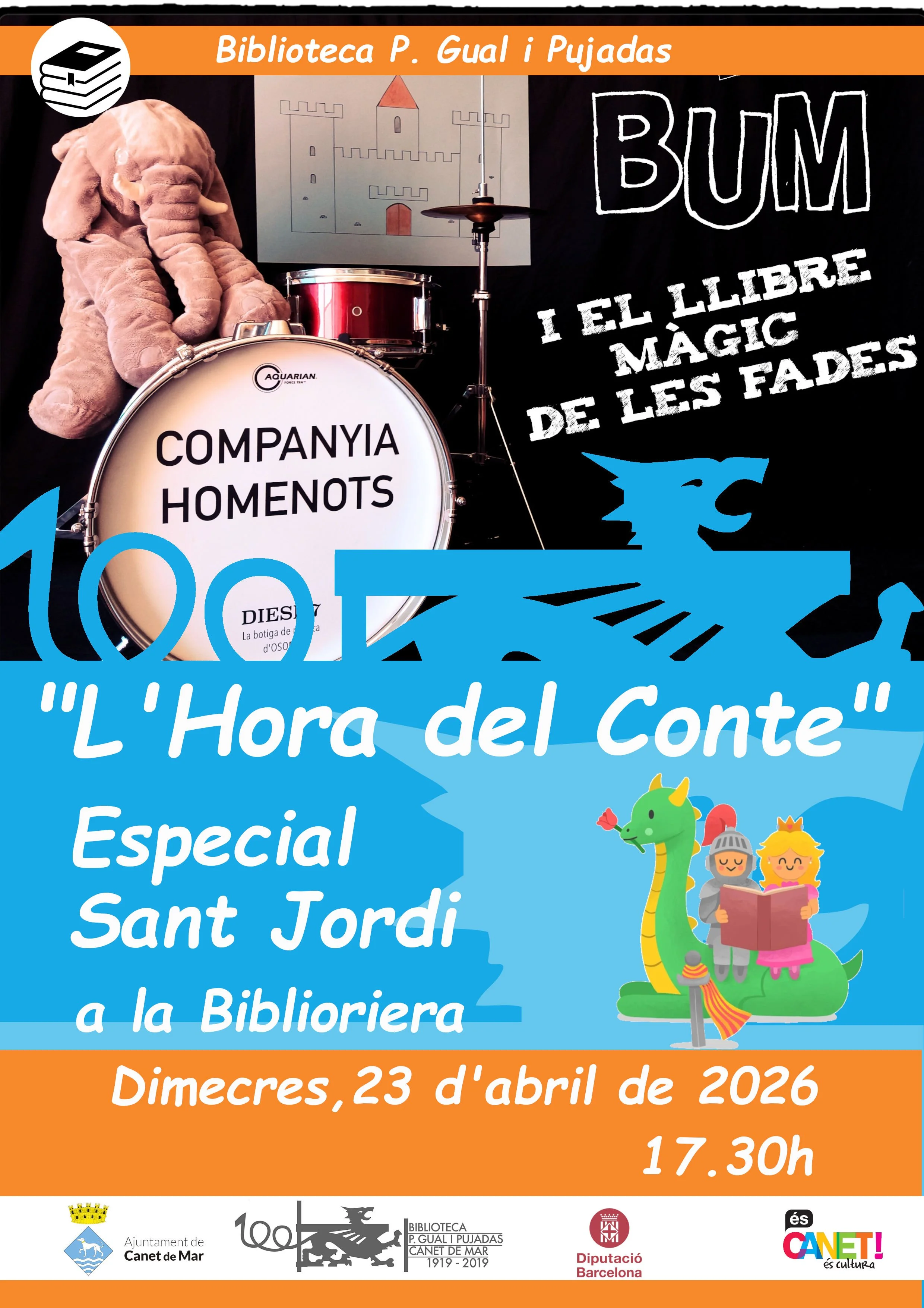Back to All Events CONTE: BUM i el llibre màgic de les fades Thursday 23 April 2026 17:30 18:30 Biblioteca P. Gual i Pujadas 1 Riera Sant Domènec Canet de Mar, CT, 08360 Spain (map) Google Calendar ICS Preu: gratuïtEdat: tota la familia BUM i el llibre màgic de les fadesUna tarda de pluja en Bum escolta la Història de la Biblioteca Màgica de les Fades i del Llibre Màgic que la fada Flor de Neu va amagar en un lloc secret. Decidirà sortir a buscar-lo, el trobarà?En BUM també ens deixarà tocar la bateria?