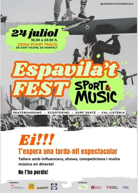 L’Ajuntament de Sant Vicenç de Montalt, en el marc del programa Joves en moviment, fem bategar Sant Vicenç, presenta la primera edició de l’Espavila’t FEST – Sport & Music, un festival amb diverses activitats esportives, entre elles les d’algunes disciplines sobre rodes com surfskate, skateboarding o scootering. Però més enllà de les rodes, també hi haurà espai per a la cal·listènia, la música en directe i molt més!