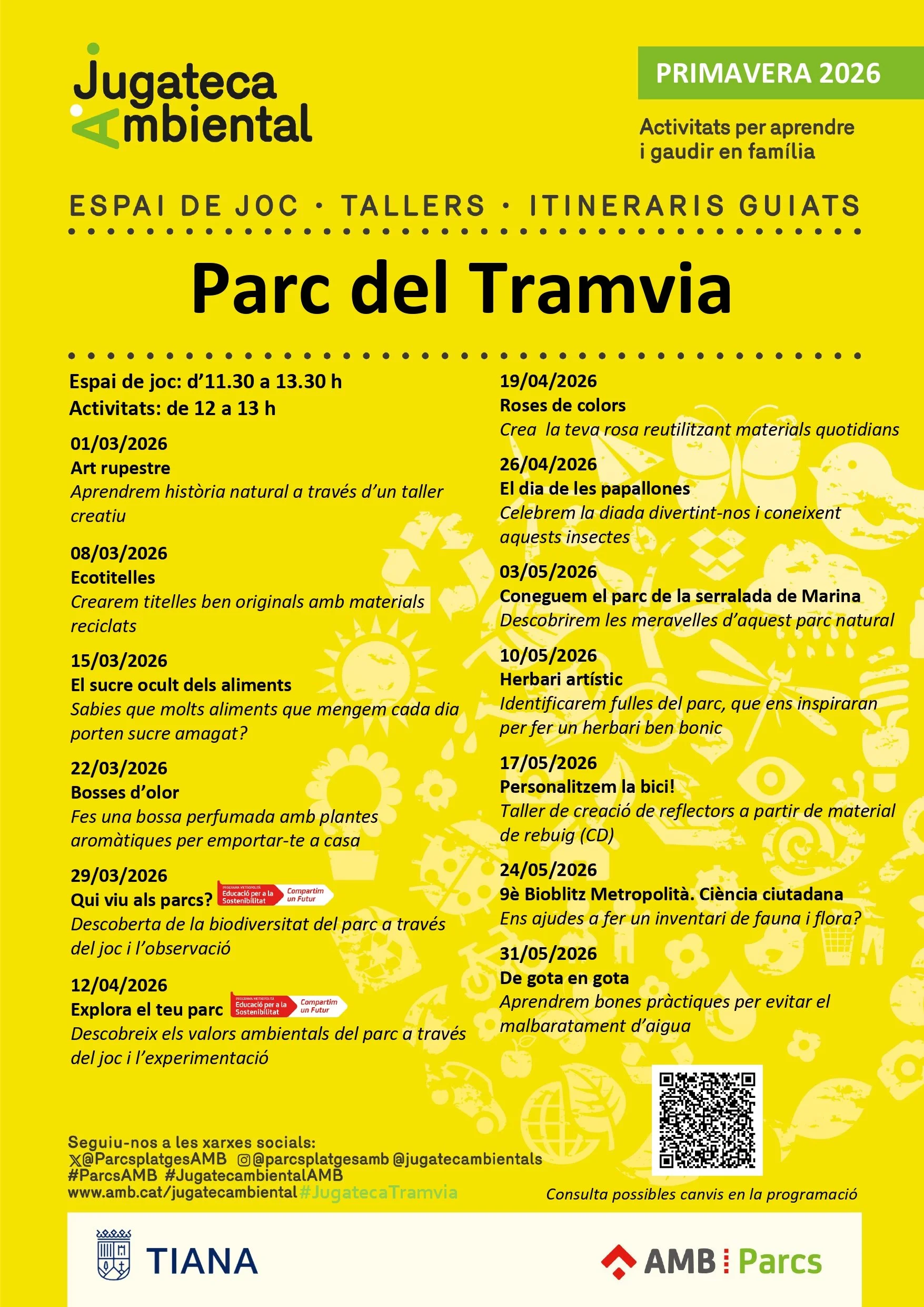 La Jugatecambiental del parc del Tramvia és un espai de joc i aprenentatge on s'ofereixen diferents activitats per fer en família durant el cap de setmana. Una de les seves singularitats és que, com el mateix parc, és compartida entre els municipis de Tiana i de Montgat, de manera que canvia d'ubicació en funció de l'època de l'any. Aquesta Jugatecambiental destaca també pel seu lloc d'emplaçament, com un cinturó verd entre els dos municipis, esdevenint un gran parc urbà on es poden realitzar circuits de salut ja que està equipat amb una àmplia zona esportiva i també, amb espais de joc per als més petits.