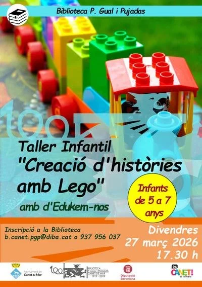 Taller infantil: Creació d'històries amb Lego amb d'Edukem-nos Les peces de LEGO es converteixen en paraules! Cada participant inventarà una història i la representarà construint escenes, personatges i emocions amb LEGO. Una manera divertida de fomentar la creativitat, el llenguatge i la comunicació a través del joc i la construcció.