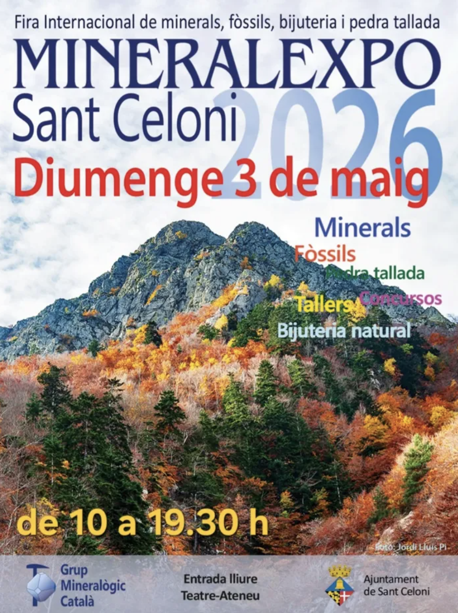 La fira MineralExpo Sant Celoni 2026, organitzada pel Grup Mineralògic Català, se celebrarà al teatre de l’Ateneu de Sant Celoni (Carrer Germà Emilià, 1 – Sant Celoni) el diumenge 3 de maig de 2026. L’horari és de 10 a 19.30 h i l’entrada és gratuïta.