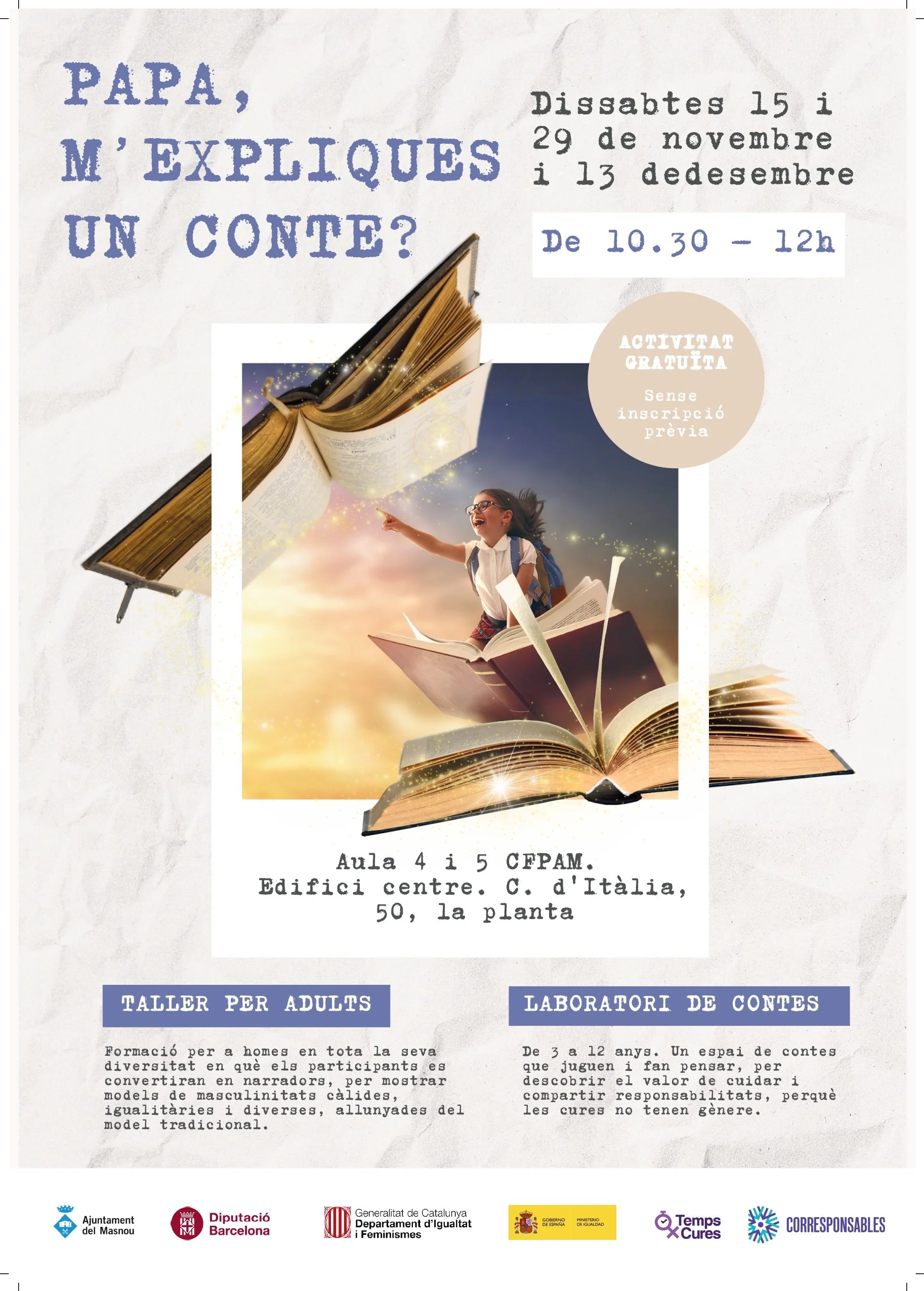 I més: Laboratori de contesde 3 a 12 anys. Un espai de contes que juguen i fan pensar, per descobrir el valor de cuidar i compartir responsabilitats, perquè les cures no tenen gènere.