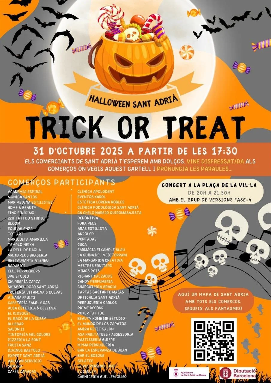 Ruta de Halloween a Sant Adrià El 31 d’octubre a partir de les 17:30h, visita els comerços de la ciutat disfressat/da, rep caramels i diverteix-te amb tota la família. A les 20h, concert a la Plaça de la Vila amb el grup FASE-4.